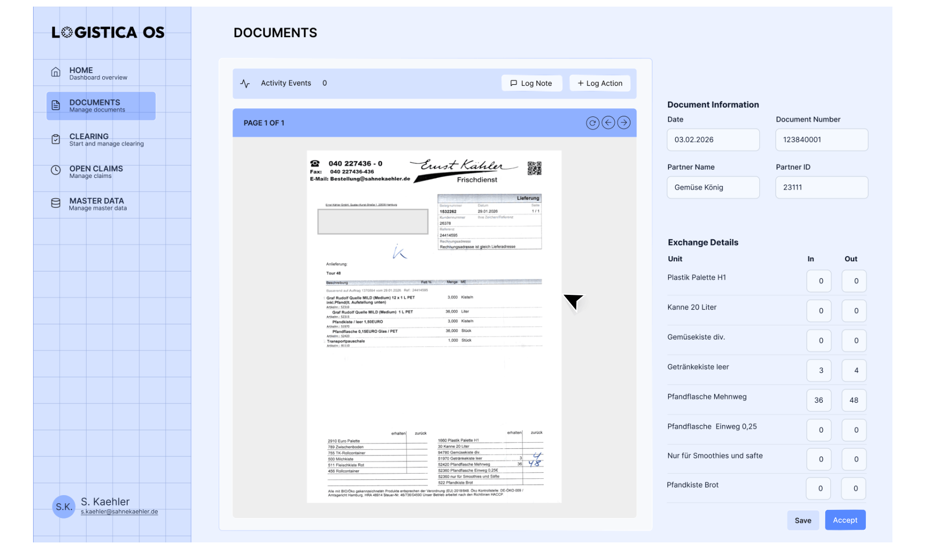 La soluzione AI di Logistica OS ora digitalizza l'intero processo di gestione dei container vuoti e dei reclami. Nella prima fase, tutte le bolle di consegna vengono scansionate senza preordinamento. L'intelligenza artificiale riconosce automaticamente quali documenti sono rilevanti per la contabilità di depositi e resi e filtra i documenti irrilevanti come fatture o liste di imballaggio.
