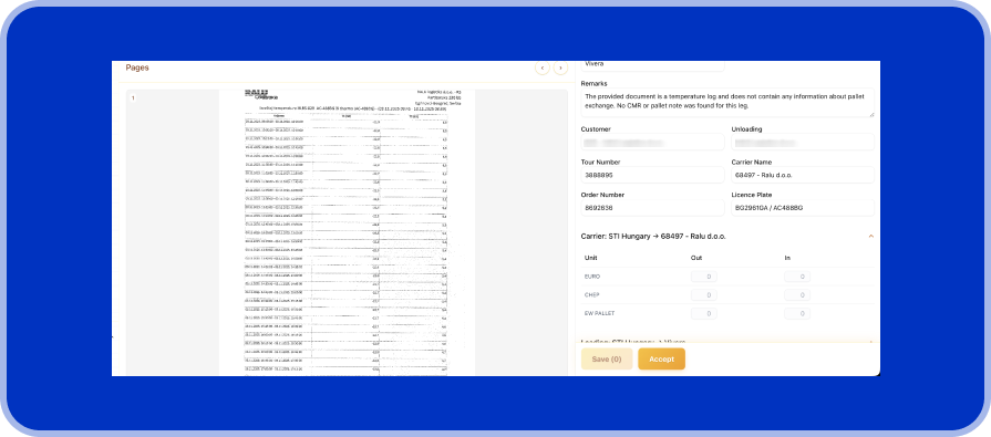In contrast, our approach combines visual language models with our own OCR methods. Chained steps and the right context let the system understand what it is looking at: which document type, which supply chain step, where load carrier transactions sit, even when the data is handwritten or tucked into stamps.